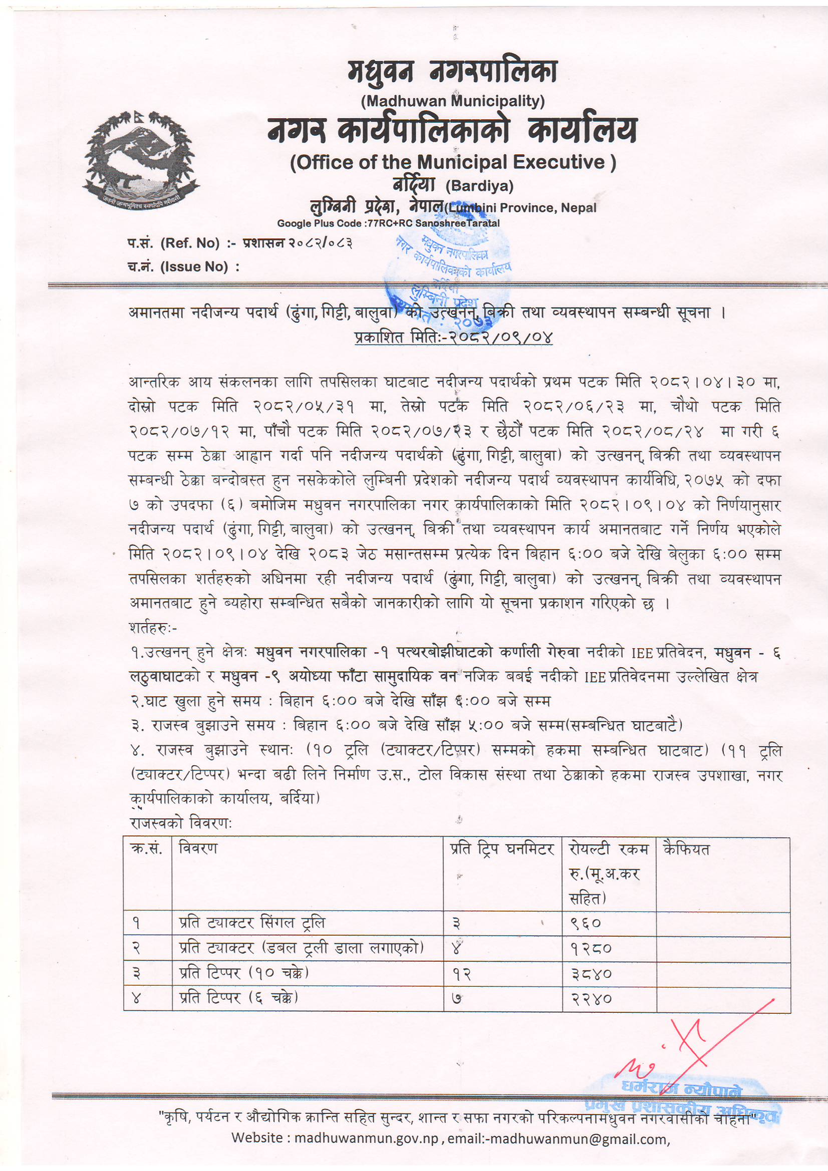 मधुवन नगरपालिका भएर बग्ने कर्णाली गेरुवा र बबई नदीबाट नदीजन्य पदार्थको उत्खनन्/संकलन र बिक्रीवितरण सम्बन्धी टेण्डर/ विद्युतिय बोलपत्र (E-Bid) आह्वानको सूचना ।।।