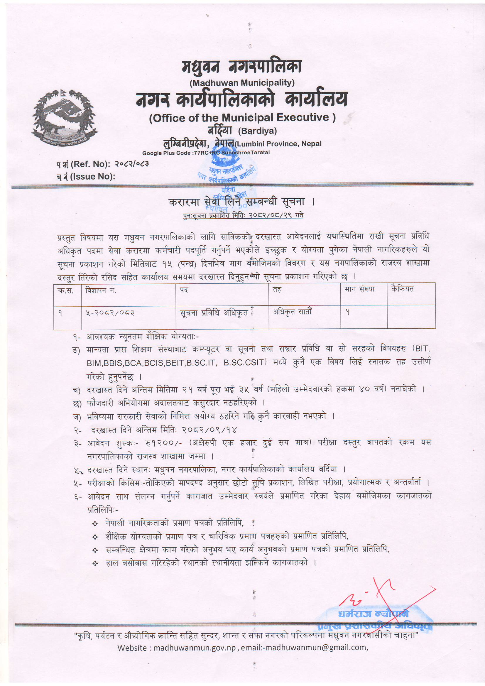 मधुवन नगरपालिकाको सल्लाहकार तथा परामर्शदाता नियुक्ति सम्बन्धी कार्यविधि,२०८२ ।।