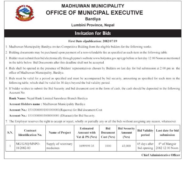 मधुवन नगरपालिका भएर बग्ने कर्णाली गेरुवा र बबई नदीबाट नदीजन्य पदार्थको उत्खनन्/संकलन र बिक्रीवितरण सम्बन्धी टेण्डर/ विद्युतिय बोलपत्र (E-Bid) आह्वानको सूचना ।।।